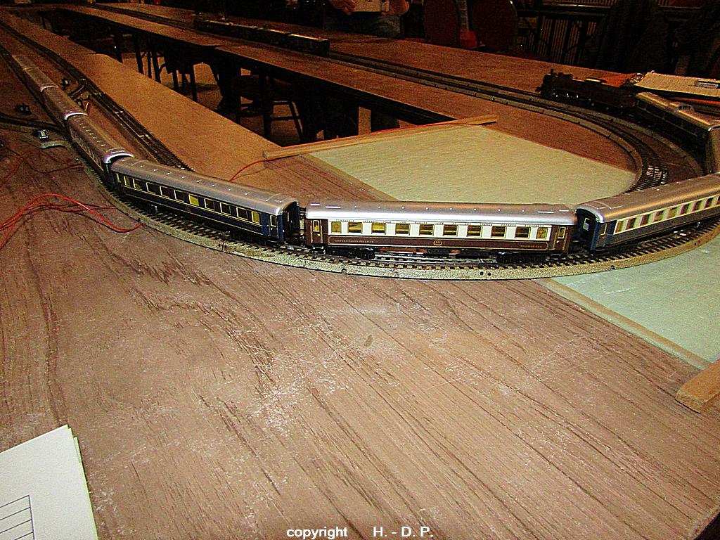 Jetzt standen wir natürlich vor der Frage bauen wir nur ein einfaches Oval auf oder trotz eines fehlenden Trafo ein Doppeloval. Wir haben uns dann doch für ein Doppeloval entschieden und es klappte dann auch sehr gut. Auch bei uns analogen gab es einiges zu sehen, so z.B. ein langer Primex Orient Express und das Sahnehäubchen war die Märklin Replika CCS 700. Es gab auch einige alte Guß Güterwagen und einen langen Autotransport Zug zu sehen. Leider, oder zum Glück waren die Stüle um die Anlage fast alle besetzt, so das ich nur wenige Bilder machen konnte, dafür sind aber alle Züge auf einem längeren Video zu sehen.