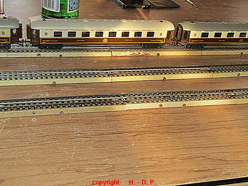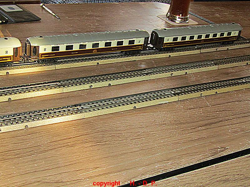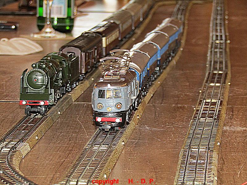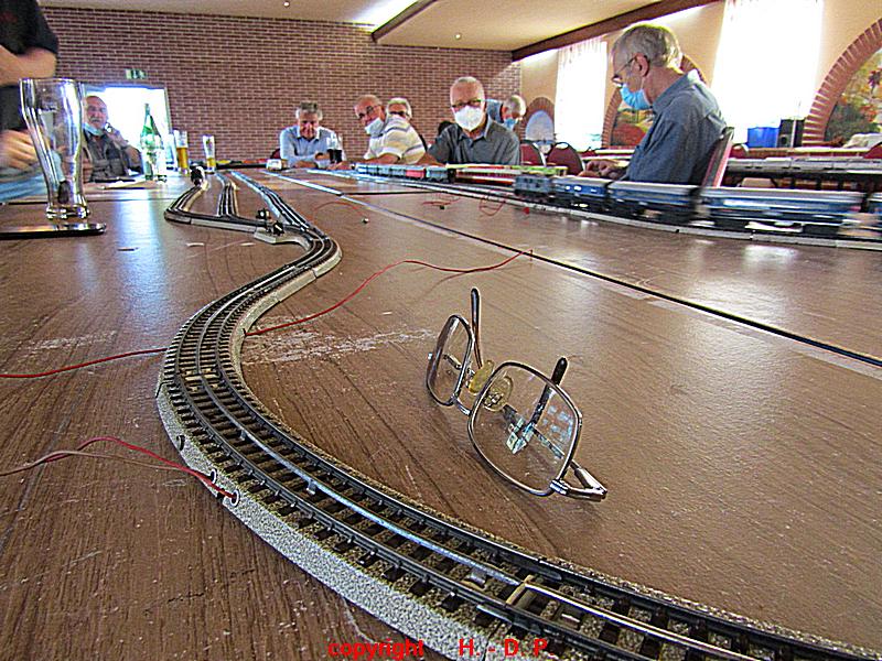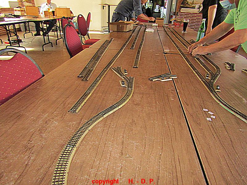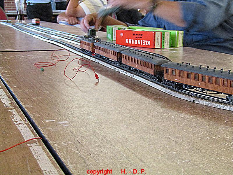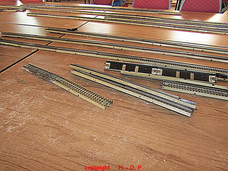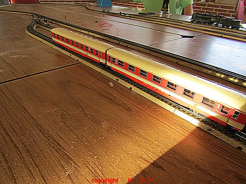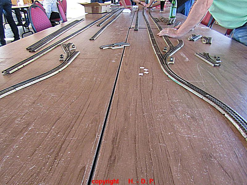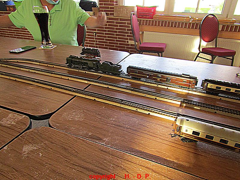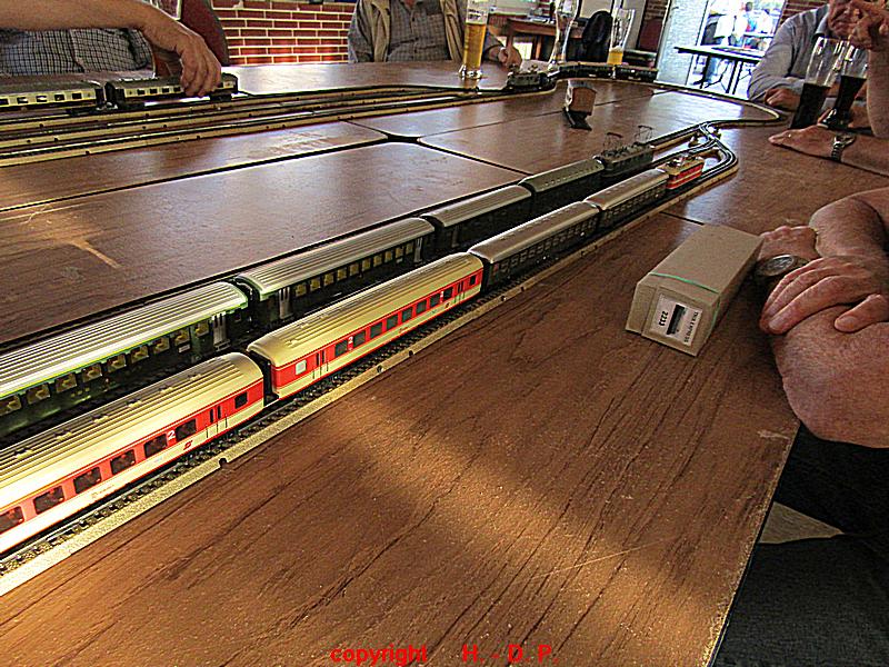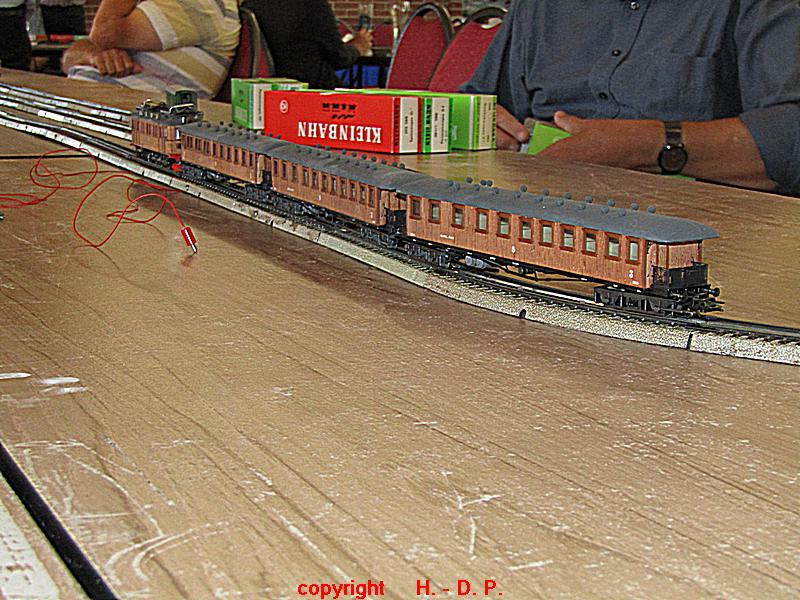 Das ganze hatte aber fast 2 Stunden gedauert, so das unser erster Zug erst gegen 19 Uhr fahren konnte. Aber die Pleiten Pech und Pannen gingen weiter. Immer wieder traten Kurzschlüsse auf, Wagen entgleisten usw.. Die Wagen entgleisten meist in den Kurven und das Problem haben wir dann auch erkannt, denn die schweren Gußwagen und Loks drückten in den Kurven die Schienen an den Gleisübergängen immer wieder um Bruchteile von mm auseinander, denn wir können die Gleise ja nicht auf die Tische schrauben. Für den nächsten Stammtisch werde ich mal doppelseitiges Klebeband mitbringen und da mit die gebogenen Schienen fixieren, ich hoffe das es helfen wird.