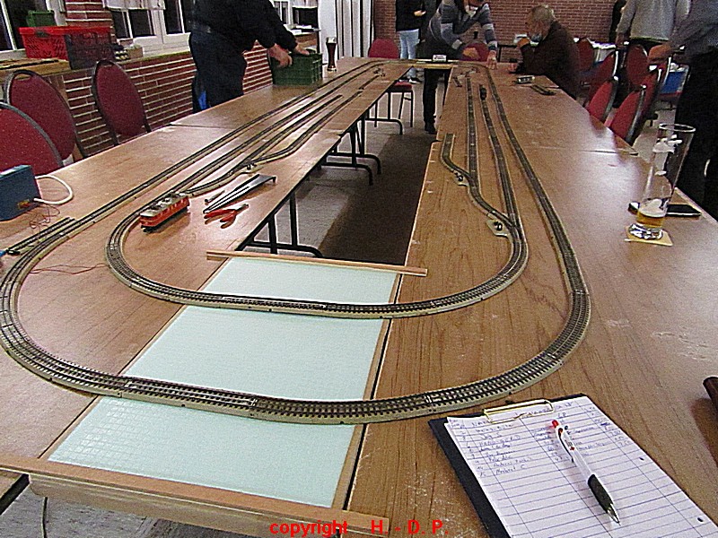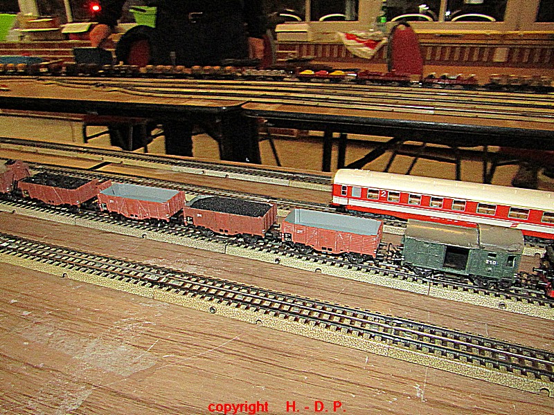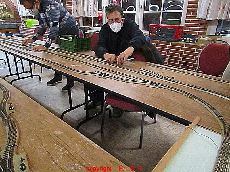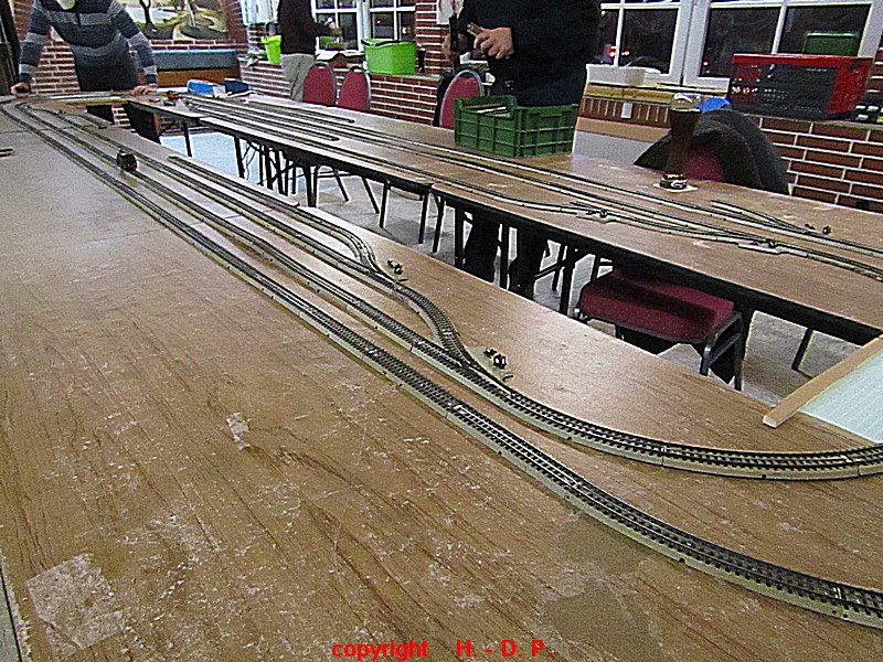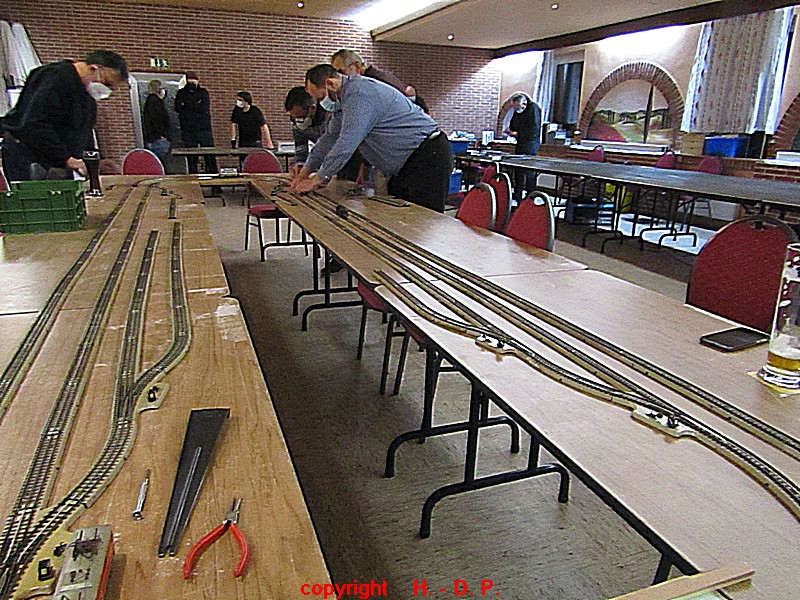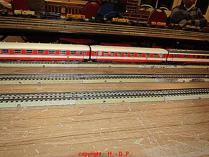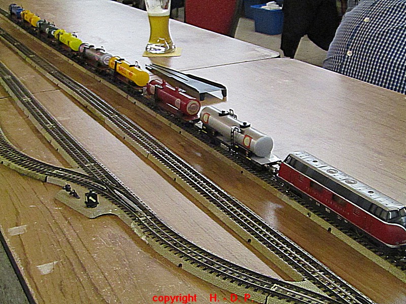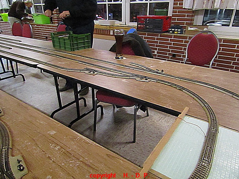 Unsere analoge Tischbahn wurde auch vergrößert und zwar um ein Oval im R II. Um aber auch noch genügend Platz auf den Tischen für das Essen zu haben, hat unser Klaus Hinrich, ich nenne es einmal Brücken, angefertigt und diese Brücken werden nun zwischen die Tische eingepasst. So haben wir nun ein zweites Oval und ach noch Platz zum Essen. Beim letzten Stammtisch hatte ich ja schon während des Aufbaus immer wieder mit einer kleinen Lok den Stromdurchfluss zu überprüfen und genau so haben wir das gestern auch gemacht. Dadurch konnte man sofort sehen wo die Lok stehen blieb und konnte das Problem beheben. Durch diese Methode konnte auch die analoge Tischbahn nach knapp einer Stunde ihren Betreib störungsfrei aufnehmen.
