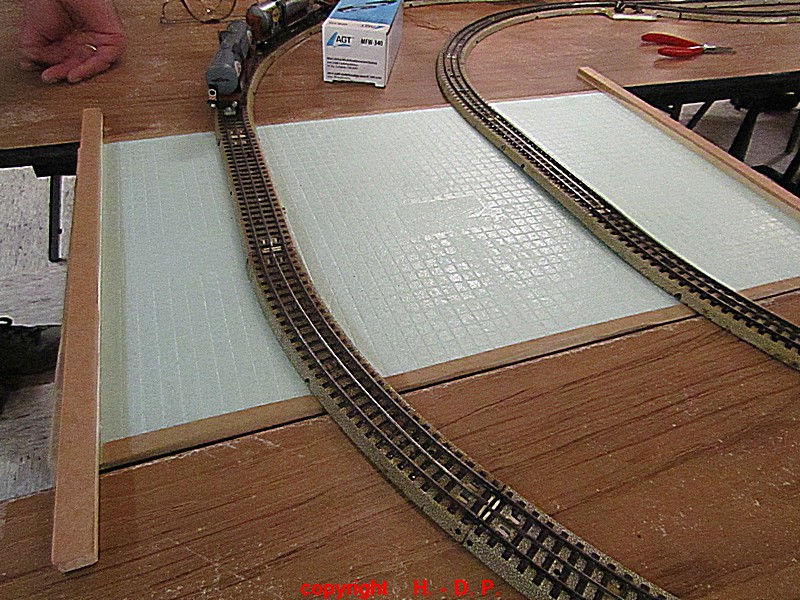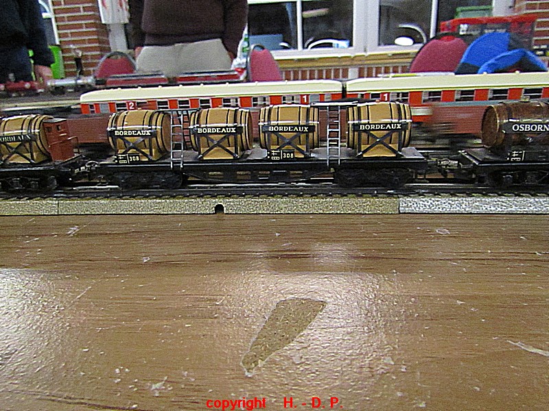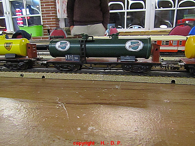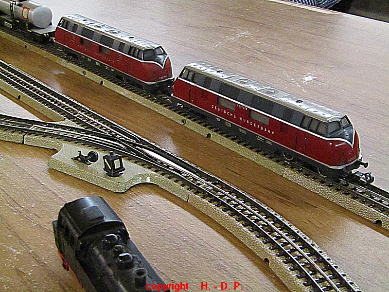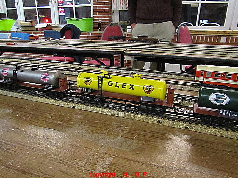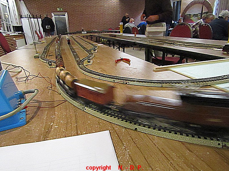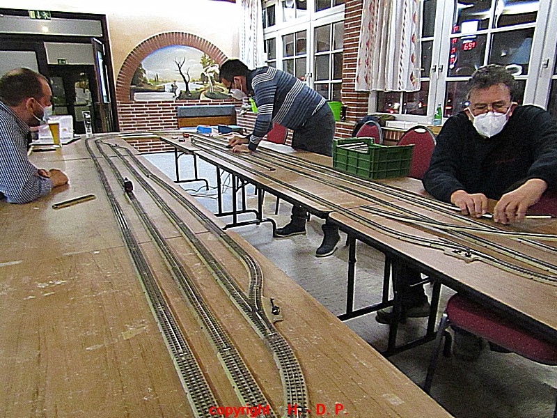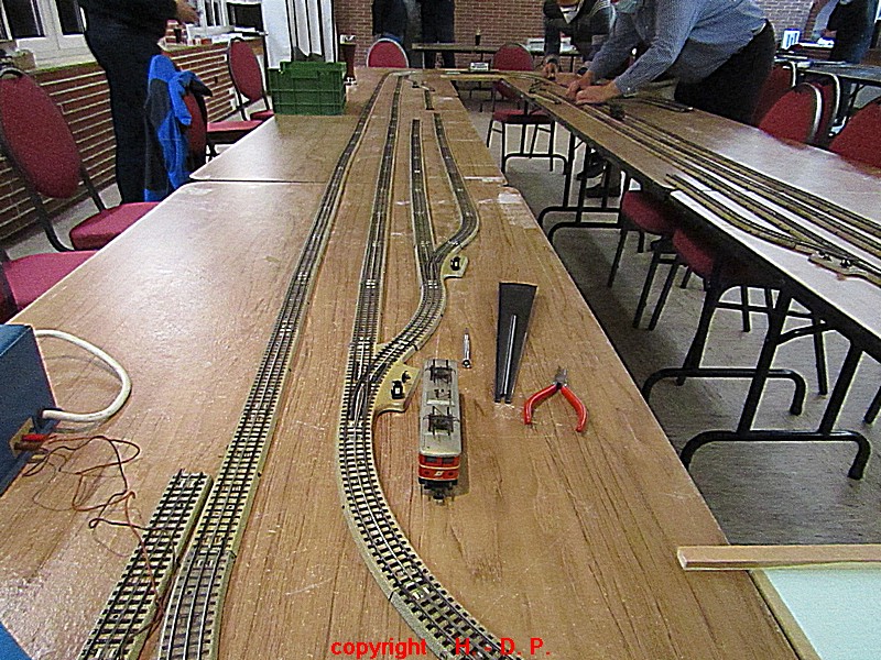 Unsere analoge Tischbahn wurde auch vergrößert und zwar um ein Oval im R II. Um aber auch noch genügend Platz auf den Tischen für das Essen zu haben, hat unser Klaus Hinrich, ich nenne es einmal Brücken, angefertigt und diese Brücken werden nun zwischen die Tische eingepasst. So haben wir nun ein zweites Oval und ach noch Platz zum Essen. Beim letzten Stammtisch hatte ich ja schon während des Aufbaus immer wieder mit einer kleinen Lok den Stromdurchfluss zu überprüfen und genau so haben wir das gestern auch gemacht. Dadurch konnte man sofort sehen wo die Lok stehen blieb und konnte das Problem beheben. Durch diese Methode konnte auch die analoge Tischbahn nach knapp einer Stunde ihren Betreib störungsfrei aufnehmen.